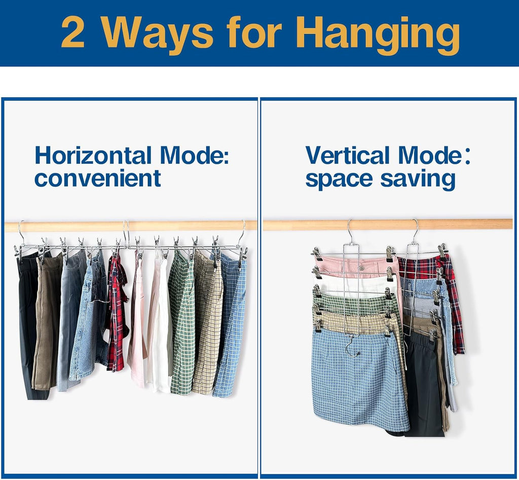 DURABILITY AND QUALITY - Crafted from robust metal,our shorts hangers promise lasting durability without any compromise on quality. Embrace the steadfastness of our small closet organizer making them a stronghold for your fashion collection.Unlike plastic or wooden hangers, these cascading skirt hangers with clips for women won't easily bend or break. Say goodbye to concerns about dust accumulation like with velvet hangers.They're perfect for saving space in your closets and maximizing storage.