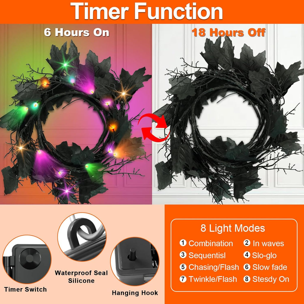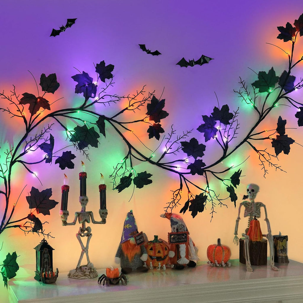【HALLOWEEN GARLAND WITH LIGHTS】2025 newly upgraded large unique Halloween willow vine twig with lights. Well-designed and handmade prelit Halloween Decorations is 9FT with total 72 spooky LED lights, including 24 purple LED, 24 green LED and 24 orange red LED. Total 24 large branches and 48 Black Leaves, creating a spooky and scary atmosphere. This unique combination is the perfect gift for family and friends.