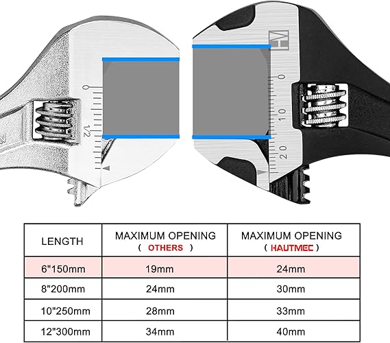 Smooth Jaw Adjustment: Adjustable wrenches features a large knurl for easily smooth adjustment and single-handed operation, besides a hex jaw design to reduce slippage by gripping fasteners tightly. Optimal head width and non-protruding jaws allow accessibility for hard to reach spaces.