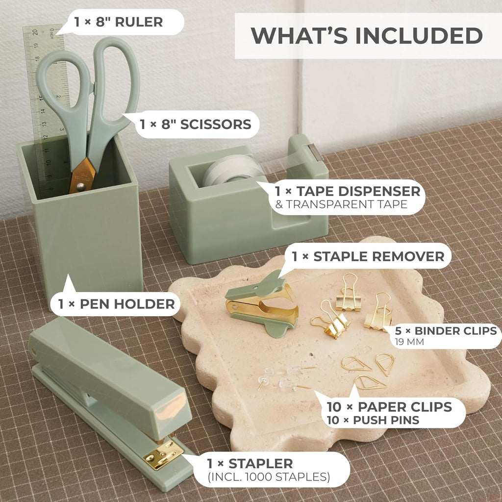 - Complete Office Organization: Keep your workspace neat with KIBAGA’s office supplies for a desk! The ultimate desk supplies set includes a stapler and tape dispenser set, scissors, pen holder and more - everything you need for a clutter-free, productive desk setup