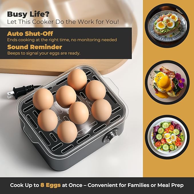 Streamline your mornings by preparing up to 8 eggs at a time with Annie & Mia Design egg boiler, cooked to your desired softness or firmness. This efficient design saves time and energy compared to traditional stovetop methods, with a convenient ready buzzer to alert you when your eggs are done