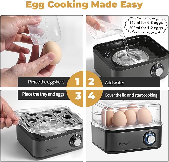 Whether you're preparing breakfast for one or hosting a family gathering, the Annie & Mia Design egg cooker helps you whip up hard-boiled eggs, soft-boiled eggs, poached eggs, and more with ease. Perfect for everyday meals and special celebrations.