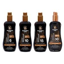 General protection spray Gels with bronzer are an innovative hybrid of a continuous spray and a traditional lotion, fitting for those looking for control, hydration and convenience, plus temporary color for an immediate glow! Enjoy the sun with confidence when you use Australian Gold sunscreens! All of our products are made with real, nutrient-rich Australian ingredients. We aim to make our formulas as clean as possible, without sacrificing powerful sun protection, so you can focus on celebrating life outside!