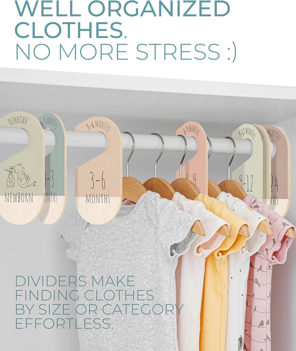 - Includes 8 sturdy wooden dividers and a sleek, minimalistic gift box. Perfect for sorting and organizing baby clothes from newborn to toddler sizes, this set is one of the baby nursery must-haves to keep your baby room tidy and stylish.