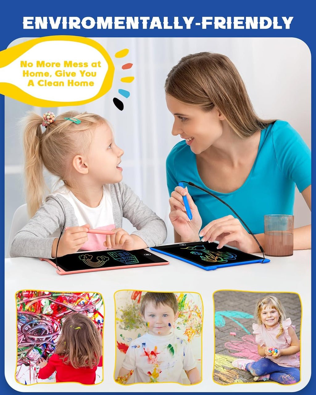 No More Mess: The reusable 8.5inch LCD writing tablet for kids has no blue light, no radiation, no glare, no damage to children's eyesight even for a long time, and also let you no longer need to worry about kids ruining your walls and sofa, keep your home clean. Note: This tablet utilizes ambient light to display content through the LCD layer, so it needs to be used in a well-lit environment.