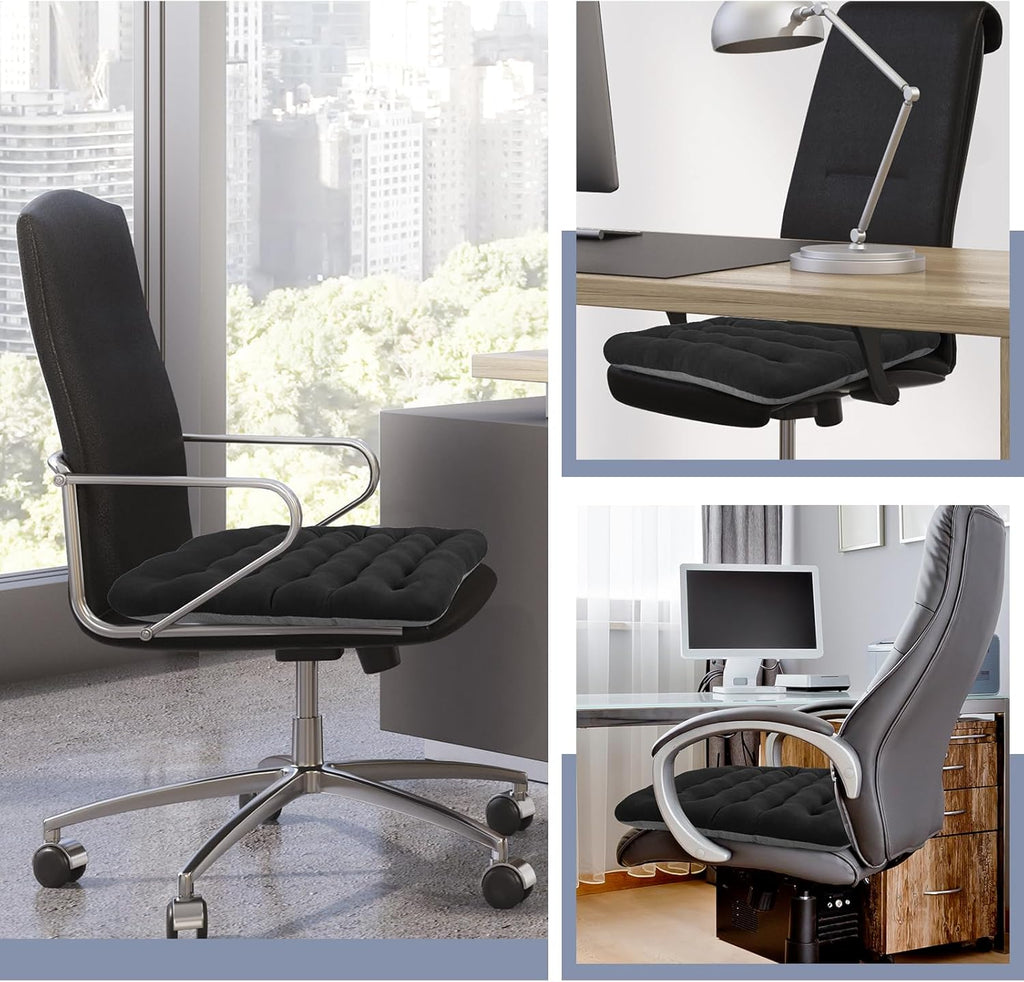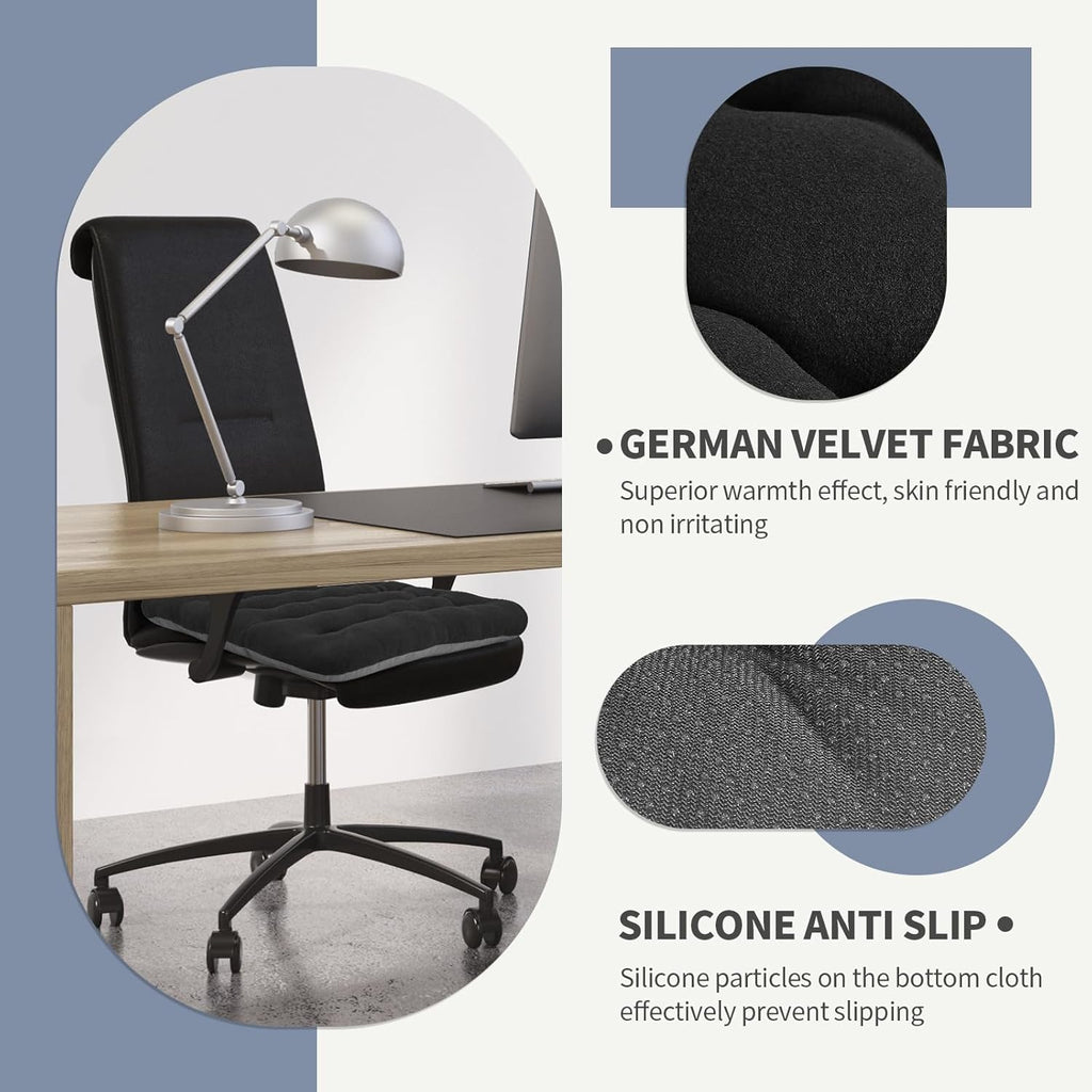16.5"W x 15.7"D x 1.6"H. Surface: Velvet. Inside: 100% Polyester. Bottom: Silicone Anti-Slip Fabric. Soft and skin-friendly design makes this chair cushion stand out functionally and visually for the office or home, making the chair more warm and comfortable.