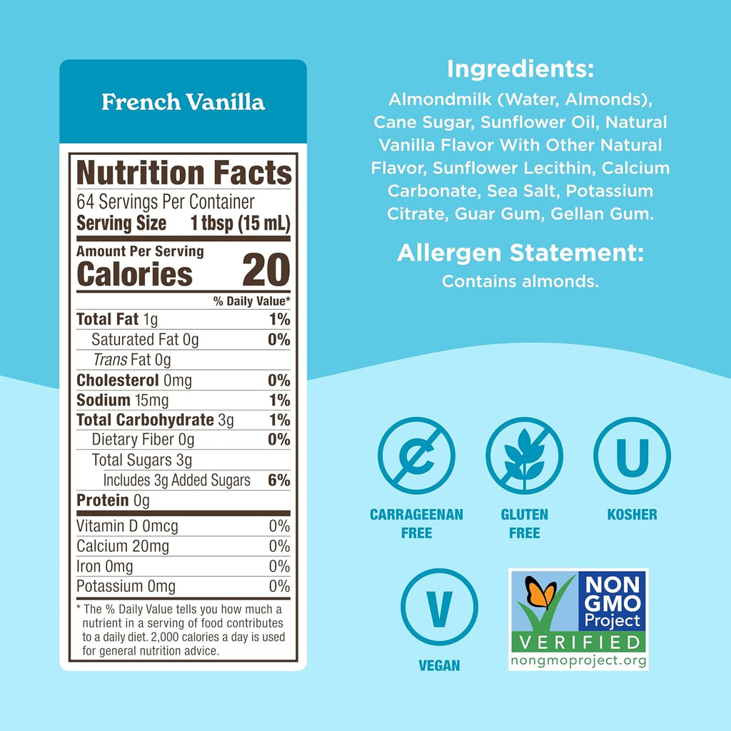 Califia Farms French Vanilla Almond Milk Coffee Creamer delivers a smooth, creamy texture with the natural sweetness of French vanilla and the subtle nuttiness of almond milk. Perfect for enhancing your coffee without dairy, it provides a rich flavor experience while catering to plant-based and lactose-intolerant consumers. This creamer adds a balanced sweetness and velvety finish, making it an ideal choice for those seeking a sophisticated dairy alternative.