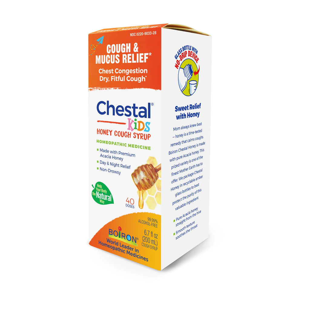 Chestal Kids Honey cough syrup by Boiron works with the body as an expectorant to improve the productivity of a cough instead of working against the body as a suppressant. It’s made with premium Acacia honey to soothe the throat and thins mucus. The blend of homeopathic medicines loosens chest congestion and relieves all common coughs that occur with a cold: productive/wet, dry, barking, croupy and night coughs.* Chestal Kids Honey is a daytime and nighttime solution — calming those dry, fitful coughs at bedtime that prevent sleep, but not affecting alertness during the day. It won’t interact with other medications. It is non-habit-forming, dye-free, and 99.9% alcohol-free.