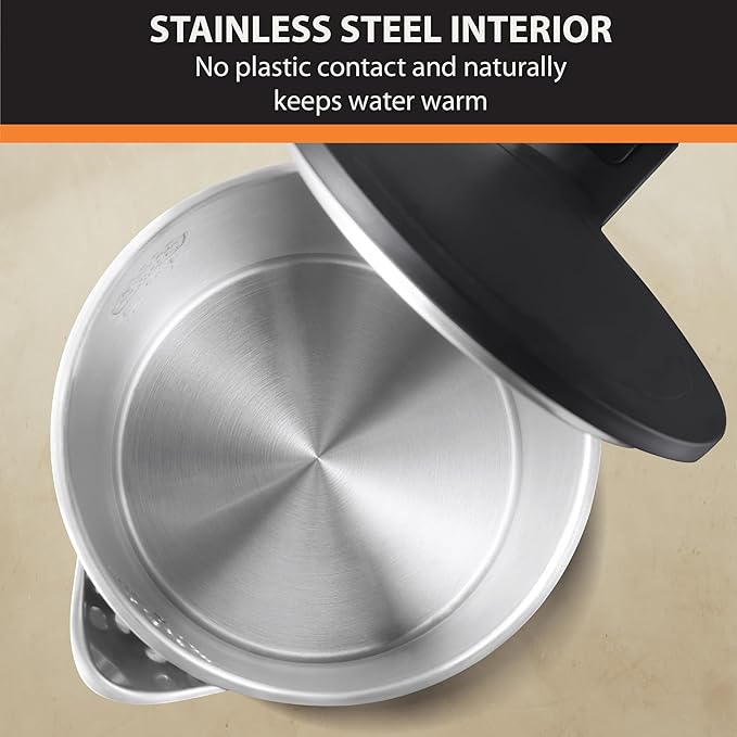 - 100% stainless steel interior—no plastic inside. Clean, odor-free hot water every time in this electric kettle that preserves purity and naturally retains heat longer.
