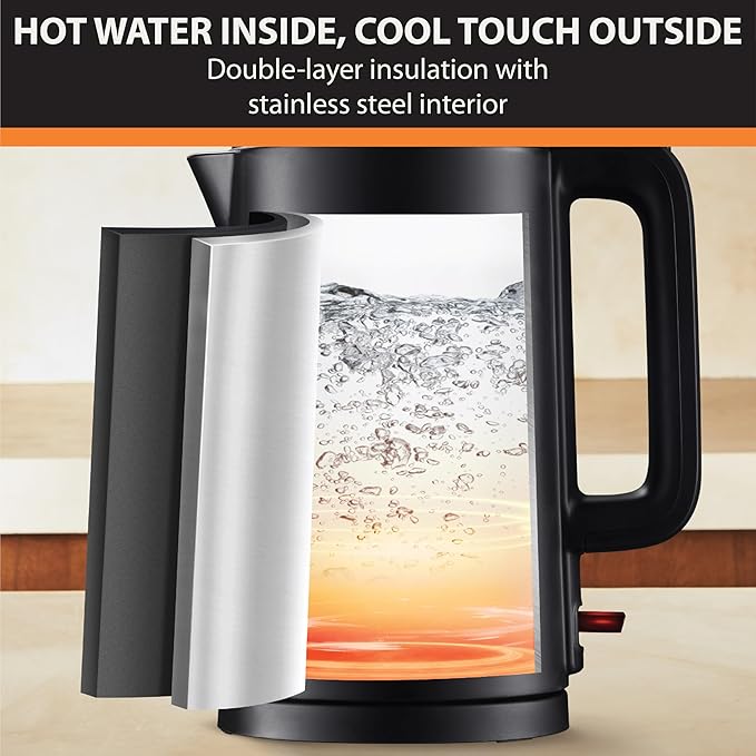 - Double-wall kettle with stainless steel interior, cool-touch exterior, and no plastic contact inside. Spout may get hot. Lid opens automatically to release steam, then lifts manually for easy refilling.