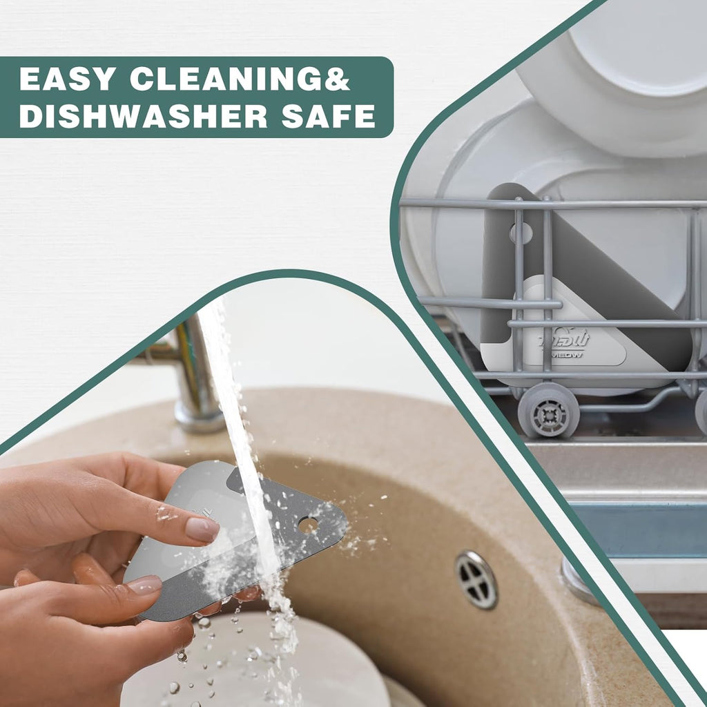 𝗙𝗼𝗿 𝗠𝗮𝗻𝘆 𝗣𝘂𝗿𝗽𝗼𝘀𝗲 - This upgraded version of the dish scraper is a combination of hard plastic and soft silicone, and the special corner design makes it convenient to clean the curved part. Not only does it remove water stains from nonstick pans, plates, bakeware and sink surfaces, it can also be used for daily cleaning of animal food bowls. Solve the use of multiple scenarios