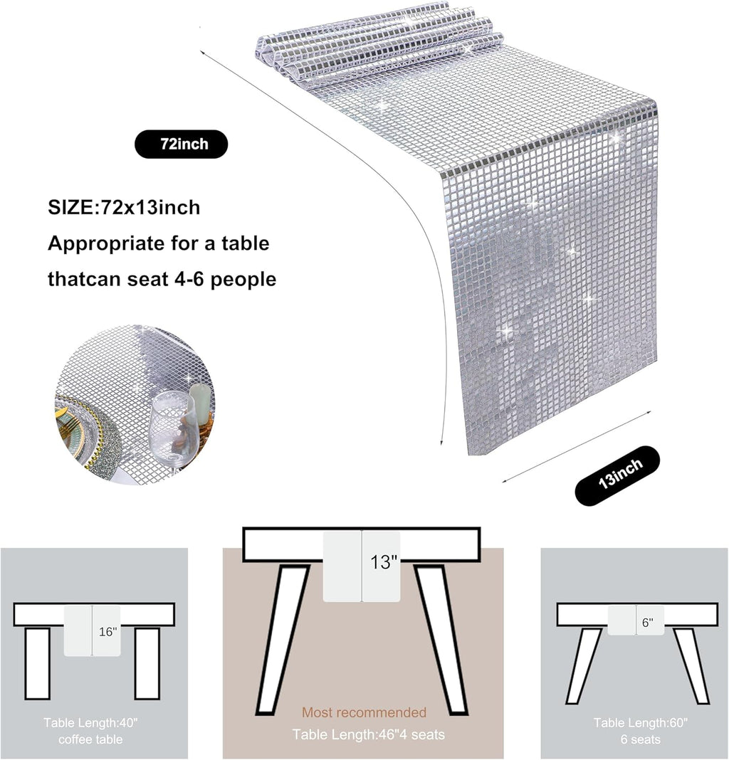 Bright Disco Party Decorations:Our silver table runner are embedded with glitter mirror surface, which is shining and full of exquisite feeling, creating a captivating and luxurious ambiance. The modern chic look appearances can easily catch the eyes of your guests,easy to match event styles.