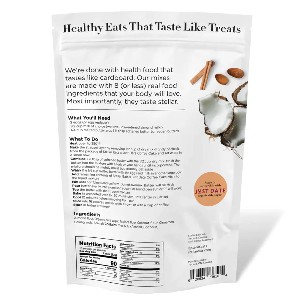 Almond Flour, Organic Date Sugar, Tapioca Flour, Coconut Flour, Baking Soda, Cinnamon, Sea Salt.