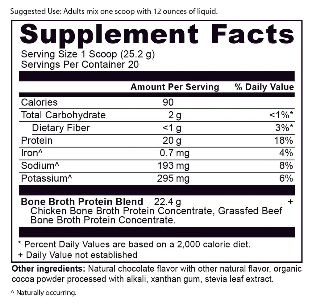 Chocolate: Chicken Bone Broth Protein Concentrate, Beef Bone Broth Protein Concentrate, Natural Chocolate Flavor with other Natural Flavor, Organic Cocoa Powder Processed with Alkali, Xanthan Gum, Stevia Leaf Extract.