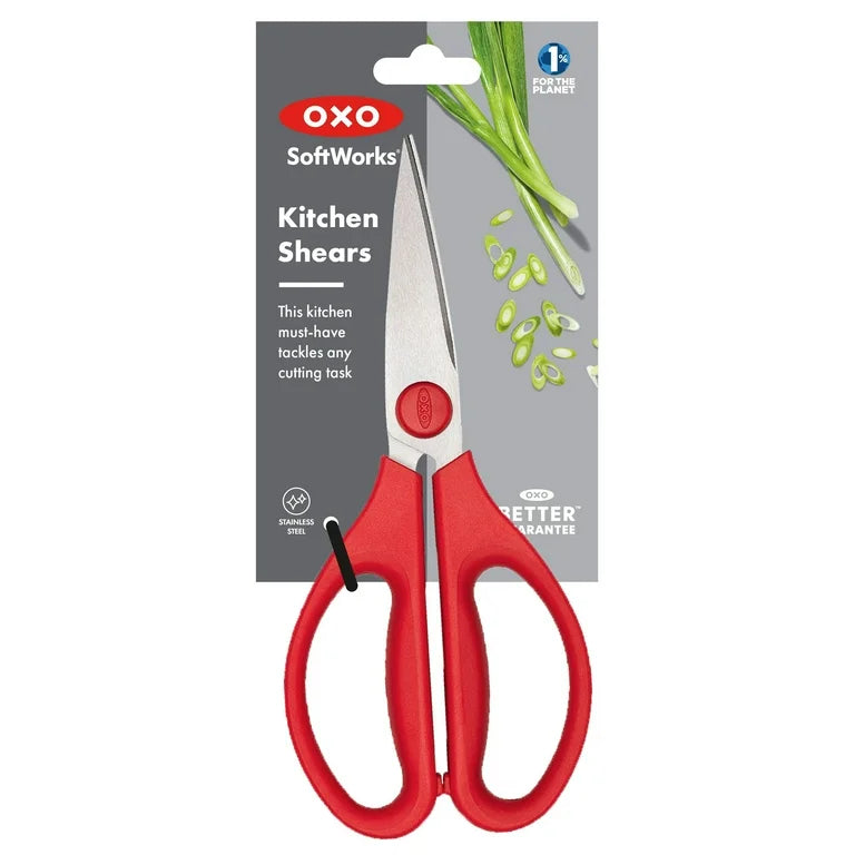 The OXO Good Grips Kitchen Shears easily cut through twine, cardboard, vegetables, meat, herbs and more. The durable stainless steel blades have a micro-serrated design that grips items securely and prevents slipping. The comfortable, non-slip handles absorb pressure when cutting and separate for through cleaning. Hand wash only.