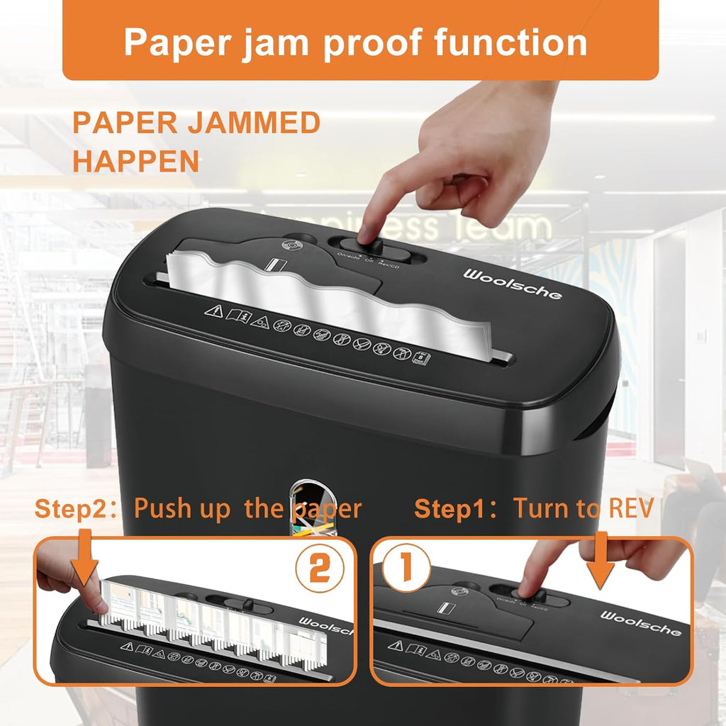 Convenient Design: The shredder offers a 5-minute non-stop shredding capability, and in case of overload, it has an auto start overheating protection function with a 30-minute cooling time. It also features a 3-mode control switch (Auto, Off, Reverse), with the reverse mode helping to release any jammed paper.