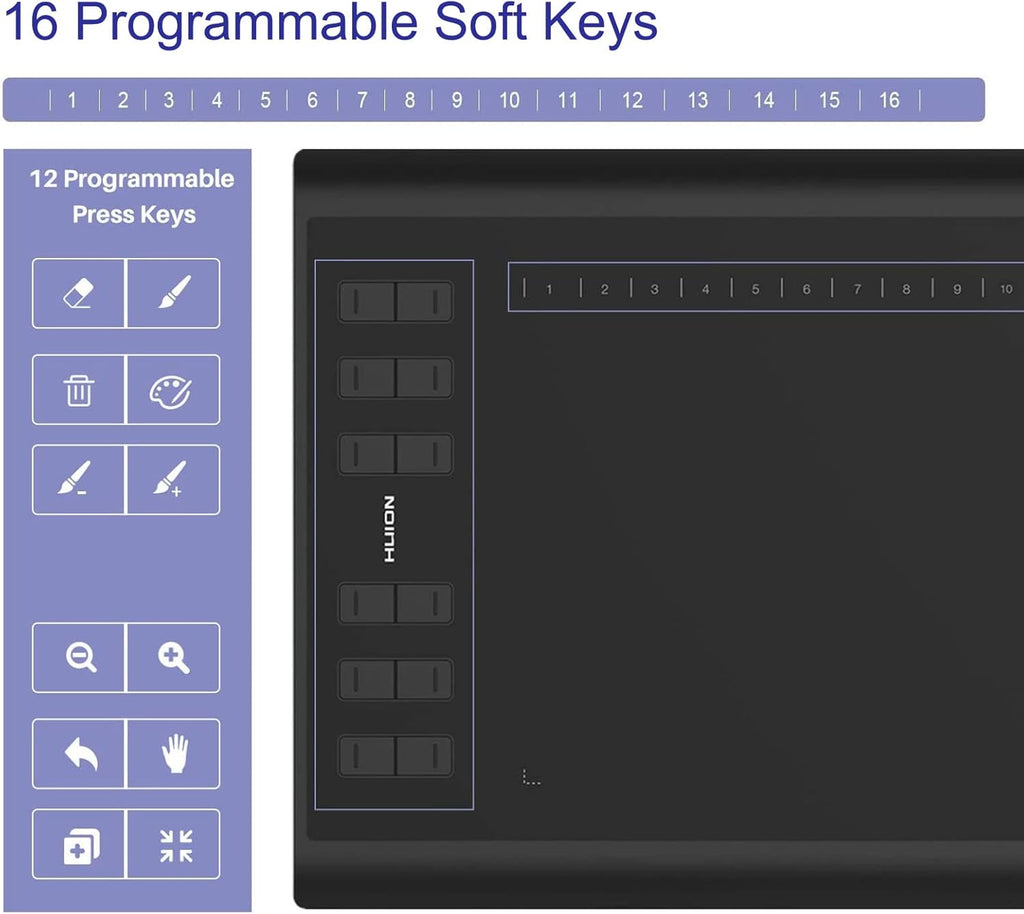 - Press Keys:12 programmable press keys plus 16 programmable soft keys, you can set shortcut keys on drawing tablet's driver based on your preferences, such as erase, zoom in/out, scroll up and down, and so on.
