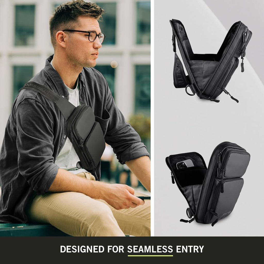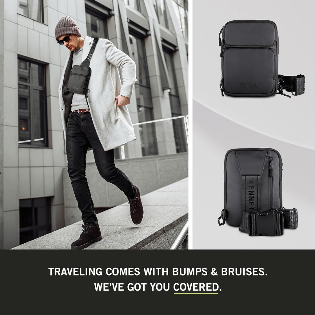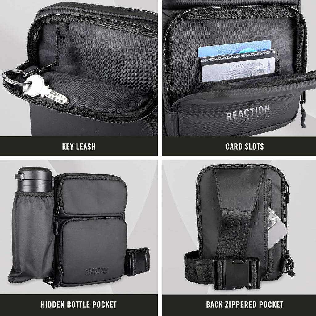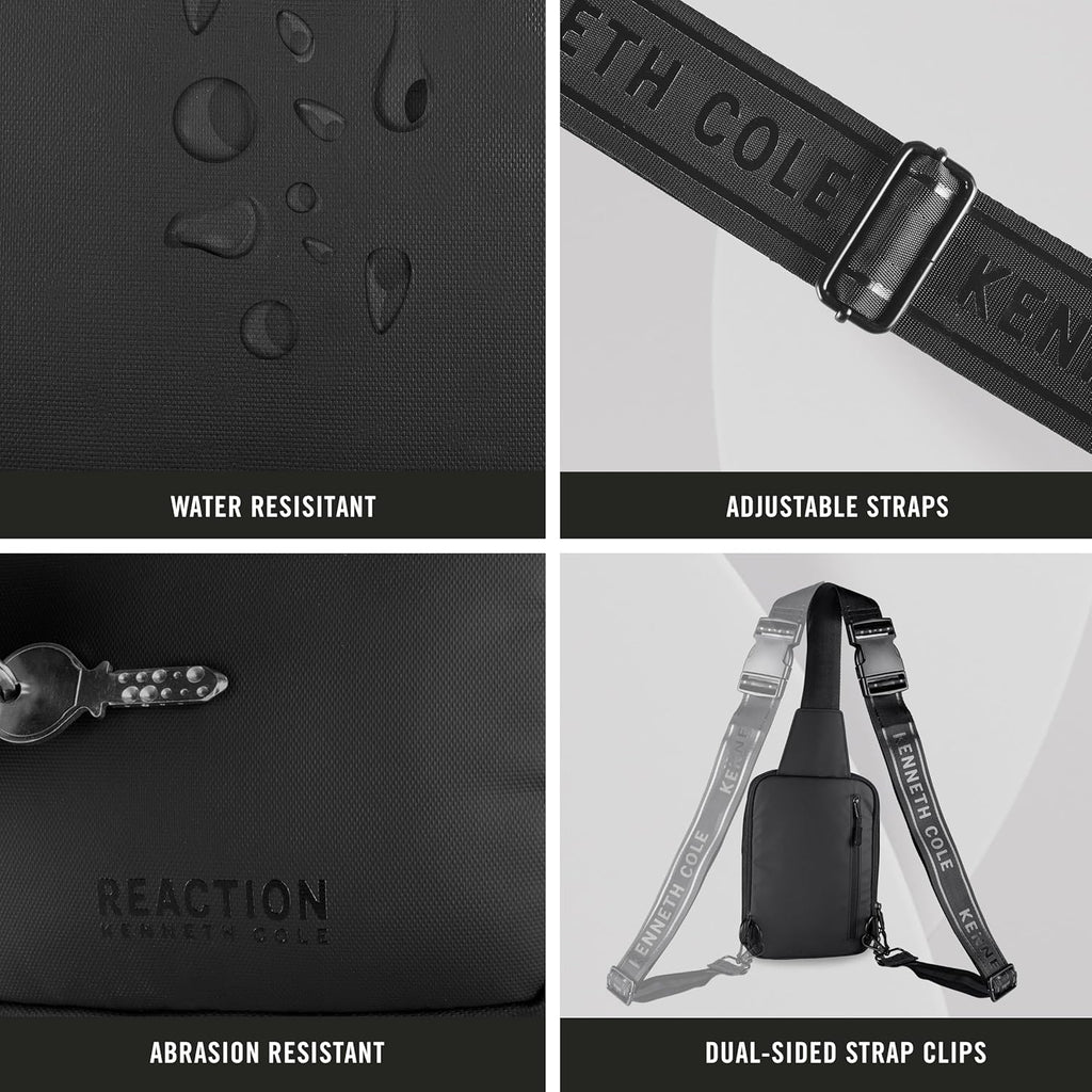 The Kenneth Cole Reaction Ryder Crossbody is the perfect addition to your everyday adventures. The stylish and durable bag is crafted from coated polyester, which is abrasion-resistant and water-resistant. This bag has all the space you need for your essentials, featuring three card slots, a key leash, front zip pockets, a spacious main compartment, and a hidden bottle pocket. The padded main compartment is perfect for your cell phone or other small tech device. Wear it on either side with a simple switch of the clips on the back. The adjustable strap extends to 47 inches allowing for a comfortable fit. Backed by a manufacturer’s lifetime limited warranty. Overall Dimensions: 6.25” x 1.5” x 9”. Weight: 0.75 lbs. Pack More Into Life with the Ryder Crossbody.