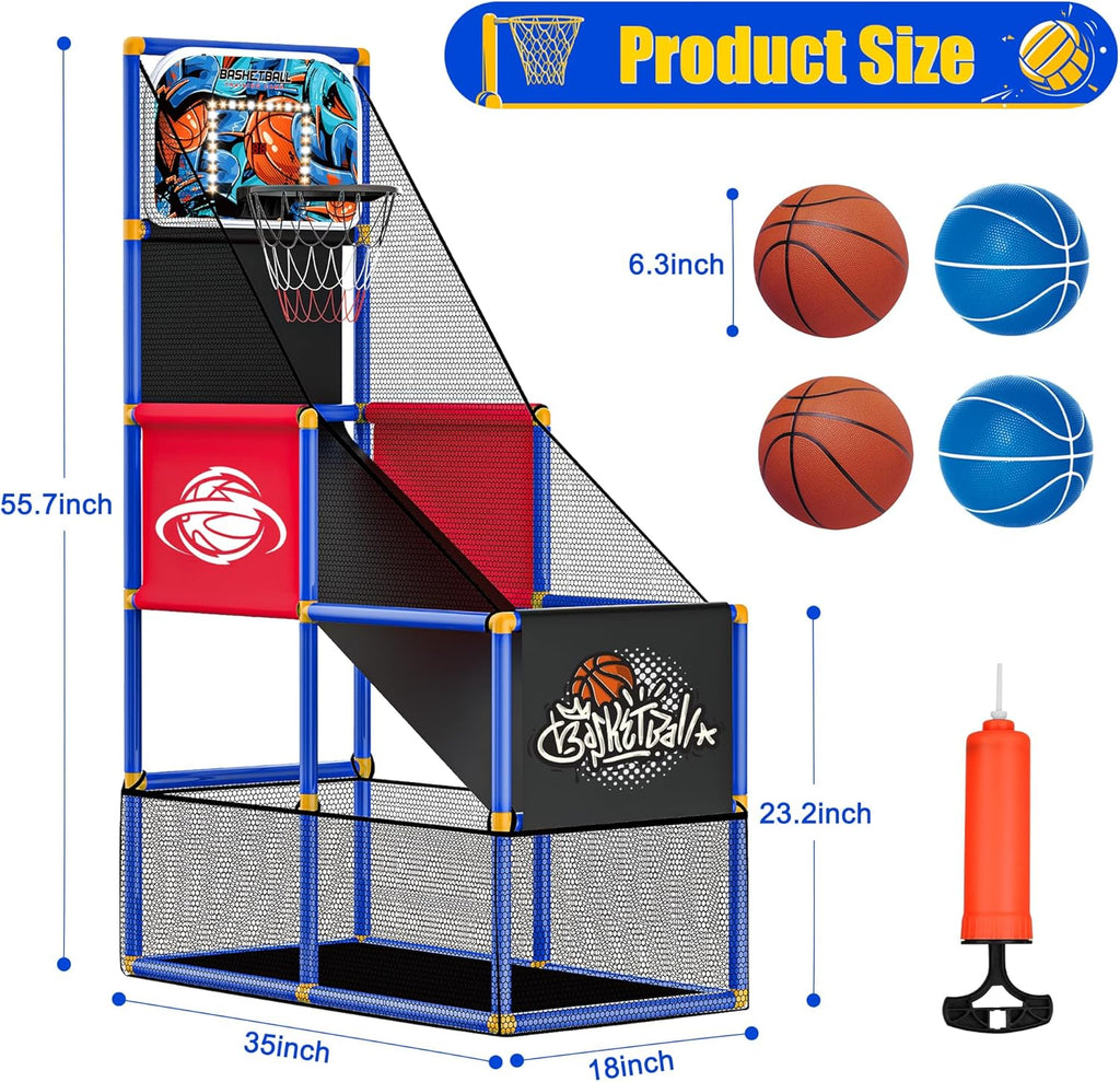 Designed with a thrilling 60-second timer, this interactive basketball set invites children to experience the excitement of a real arcade game from the comfort of home.Each successful basket awards 2 points, while missed shots initiate an engaging countdown, adding to the intensity of the game.The jubilant cheers that resonate every time a child sinks consecutive shots. This dynamic feedback not only creates an encouraging atmosphere but also motivates young players to continue shooting and scoring, fostering a love for physical activity