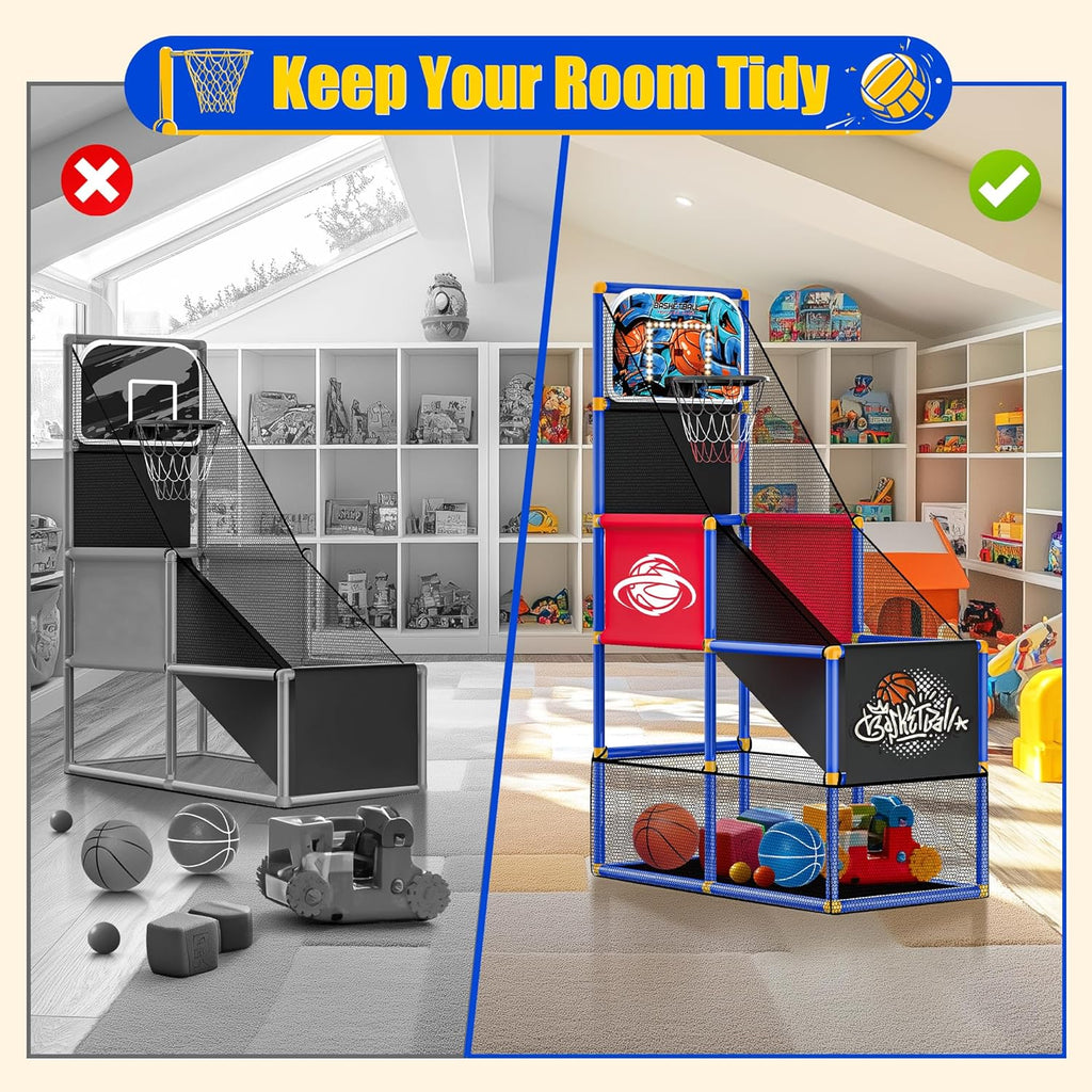 The mesh basket is designed to ensure that none roll away during play. It not only enhances convenience but also allows children to immerse themselves in the game without distractions.The spacious bottom space provides ample room to stow away basketballs and other toys.Maintaining a clean and organized play area helps kids understand the importance of environment orderly.By encouraging kids to tidy up after play,it teaches valuable lessons in responsibility and space management