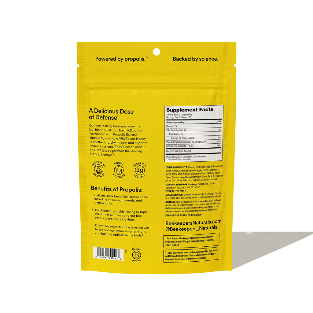 Beekeeper's Naturals has taken their best-selling lozenges and created a kid-friendly lollipop. Each lollipop is formulated with Propolis Extract, Vitamin D, Zinc, and Wildflower Honey to soothe scratchy throats and support immune systems. They’ll never know it has 50% less sugar than the leading lollipop lozenge.**
