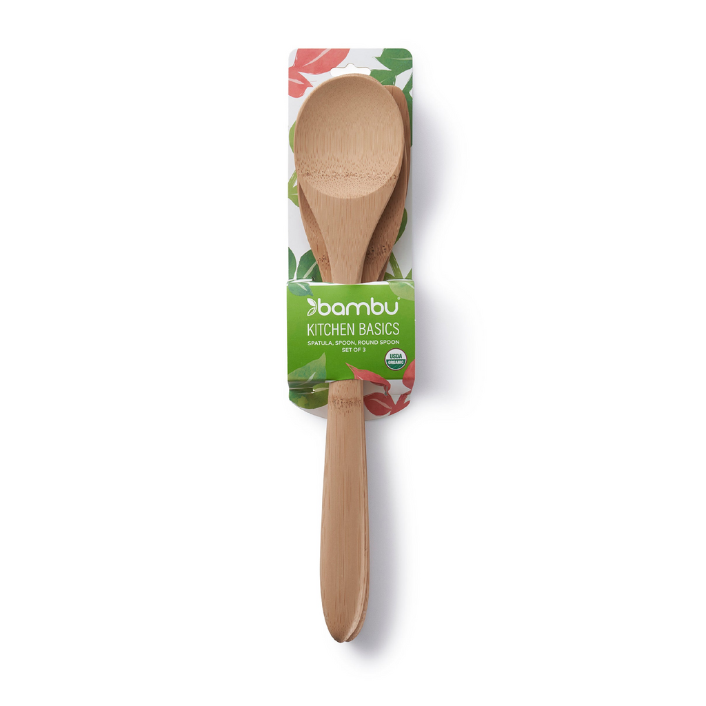 This indispensable trio of bamboo cooking utensils includes an oval spoon, a round spoon, and a spatula—each made from a single piece of USDA certified organic bamboo. Each piece of this bamboo kitchen utensil set is hand burnished to a naturally-smooth finish. Sold as a set of 3 utensils: 1 oval spoon, 1 rounded spoon, 1 spatula. Each measures 12 inches long