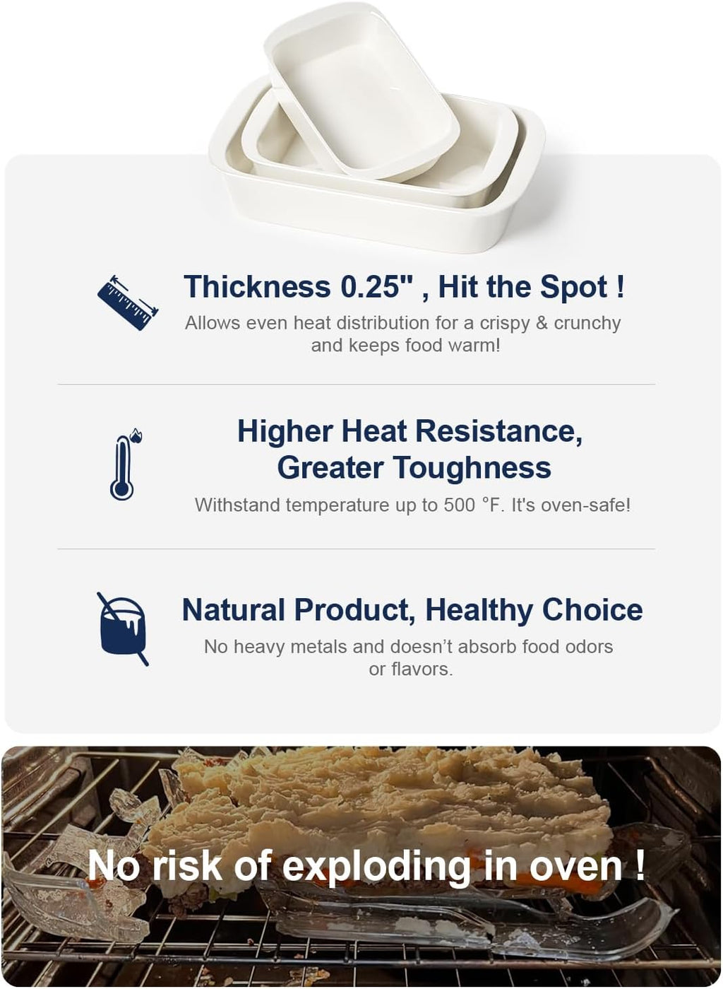 High-Quality, Safe Ceramic: Made from durable, lead-free ceramic, this casserole dishes set is oven-safe up to 500°F and is also microwave, dishwasher, and freezer safe. Non-stick ceramic and rounded corners make cleaning easier. *Do not use directly on the stove