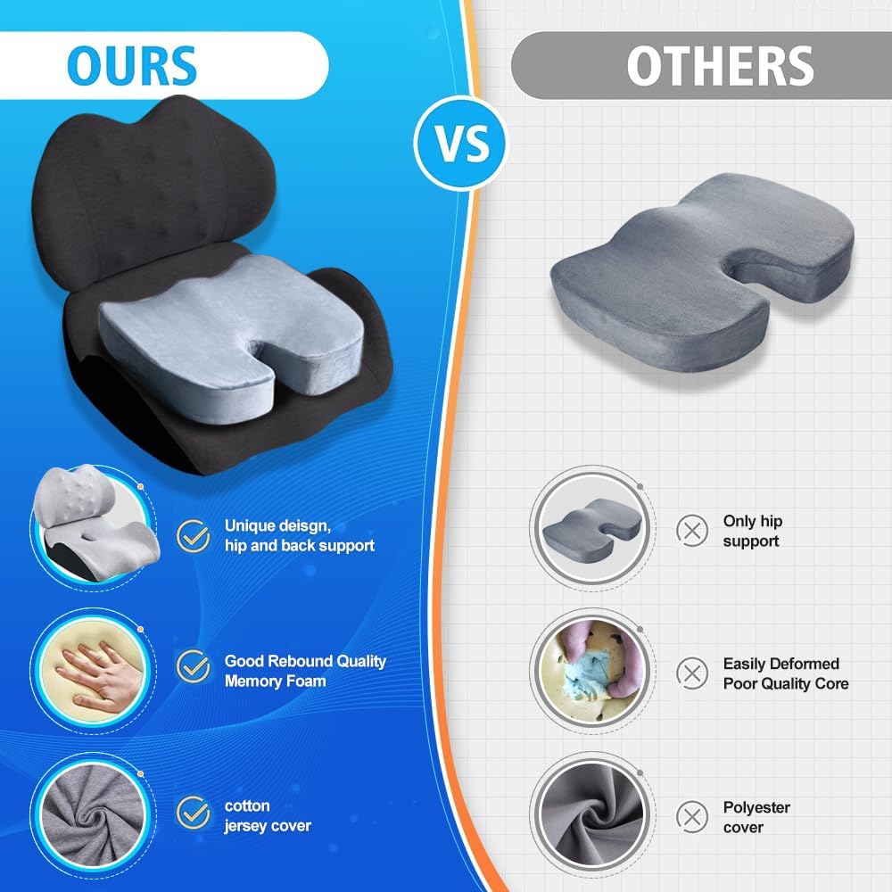 Our product has two advantages Unique design and Extra Large size ,unique design offer you wonderful support and comfort for both your hip and back , curve design seat cushion offer you comfortable posture and massage function lumbar support pillow give your back more comfort ,Extra-large size offer your more space to sit on seat cushion .