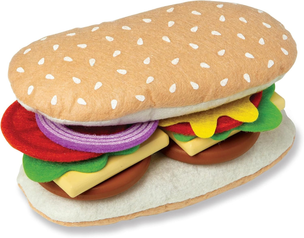 Serve up deli-fresh fun with the Melissa & Doug Wooden Sandwich Counter, kids kitchen playset! Young chefs can slice, stack, and serve custom sandwiches with 52 pretend play kitchen toys, including wooden meats, cheeses, and dressing bottle, a felt sandwich roll and toppings—plus chips, cookie, and a drink cup. The sturdy wooden deli counter also features a working slicer, a double-sided sign with menu and sandwich prep instructions, and play money to pay for each order. It’s a deliciously fun way to build counting, sorting, sequencing, and fine motor skills, with premium quality wooden toys for toddlers that inspires imaginative storytelling play.