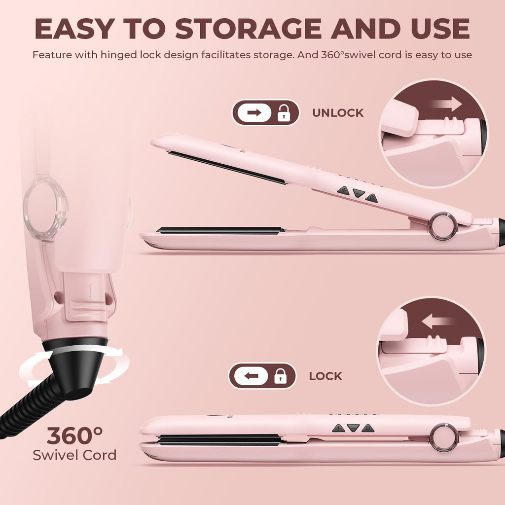 Safe & Convenient Design: The 1-hour auto shut-off function prevents accidents if you forget to turn it off, giving you peace of mind. The lockable design allows for compact storage—simply slide the lock to keep the plates closed. Plus, the 360° rotating swivel cord prevents tangling, making styling from any angle hassle-free.