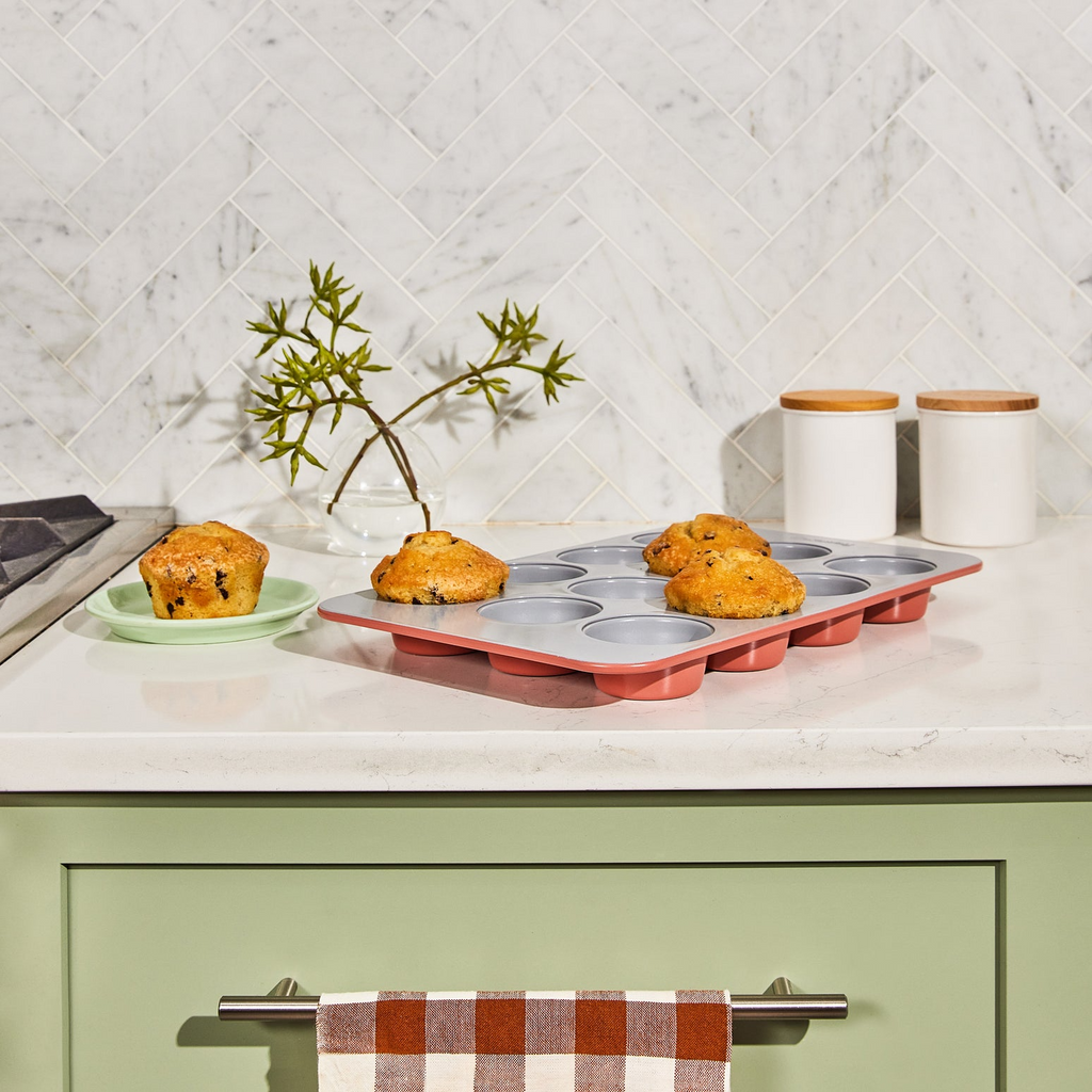 Caraway's 12-cup Muffin Pan enables you to bake goods without any of the bads: use for blueberry muffins, egg-white bites, and more. Featuring a non-toxic, naturally slick ceramic coating, this durable pan makes healthy baking (and clean up) easier than ever.