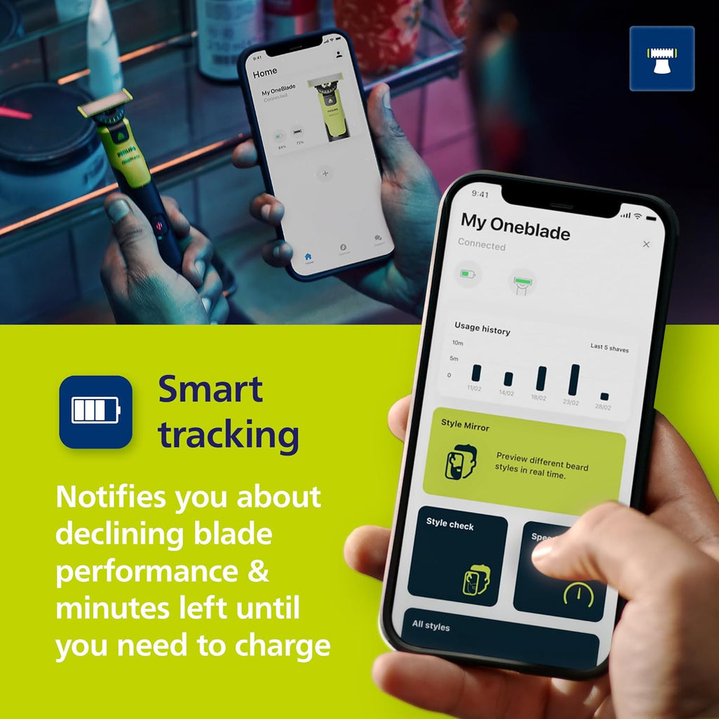 The Philips Norelco OneBlade 360 has a revolutionary new technology designed for facial styling and body grooming. It can trim, edge and shave any length of hair. The unique OneBlade technology integrates a fast-moving cutter (12,000x per minute) with a Dual Protection System to give you an efficient, comfortable shave on longer hairs. The innovative 360 Blade can flex in all directions to adjust to the curves of your face. Easily trim and shave hard‐to‐reach areas — with few strokes and great comfort. OneBlade does not shave too close, so your skin stays comfortable. Forget about using multiple tools. OneBlade does it all. You can use this face shaver and beard trimmer for men wet or dry, with or without foam, creams, or gel or in the shower, making this a great trimmer/ razor choice for men. It's time to get your perfect facial style and stubble. Using the free OneBlade app, you know when to switch up a blade or charge up the battery, and you get personalized recommendations based on your actual grooming routine. Each replacement blade can last up to 4 months² and is effortlessly easy to use. ¹ vs. its predecessor while shaving ² Replace every 4 months for the best shaving experience. Based on 2 full shaves per week. Actual results may vary.