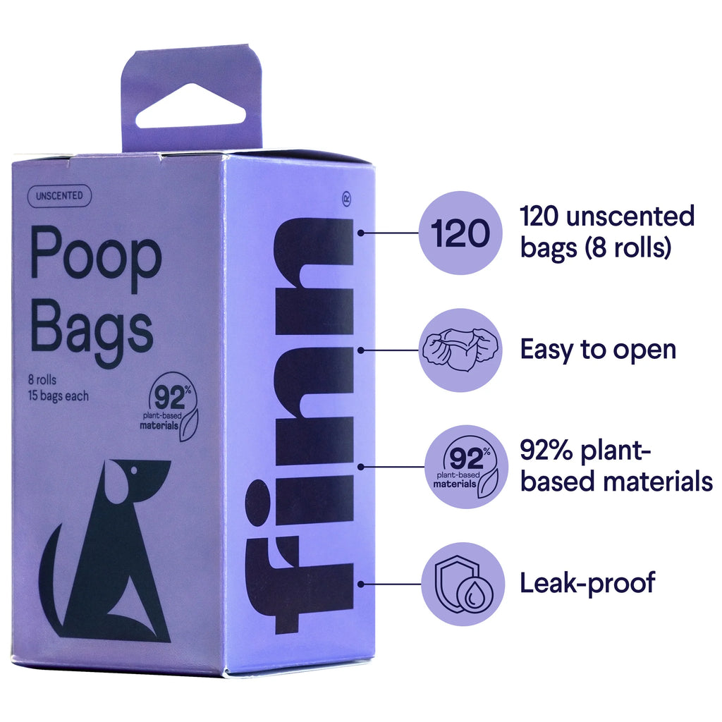 With Finn’s poop bags, you can tackle clean-ups confidently, knowing you’re making a greener choice for your pup and the planet. Each box includes 120 large, unscented bags (8 rolls of 15). Made for dogs of all breeds and sizes.