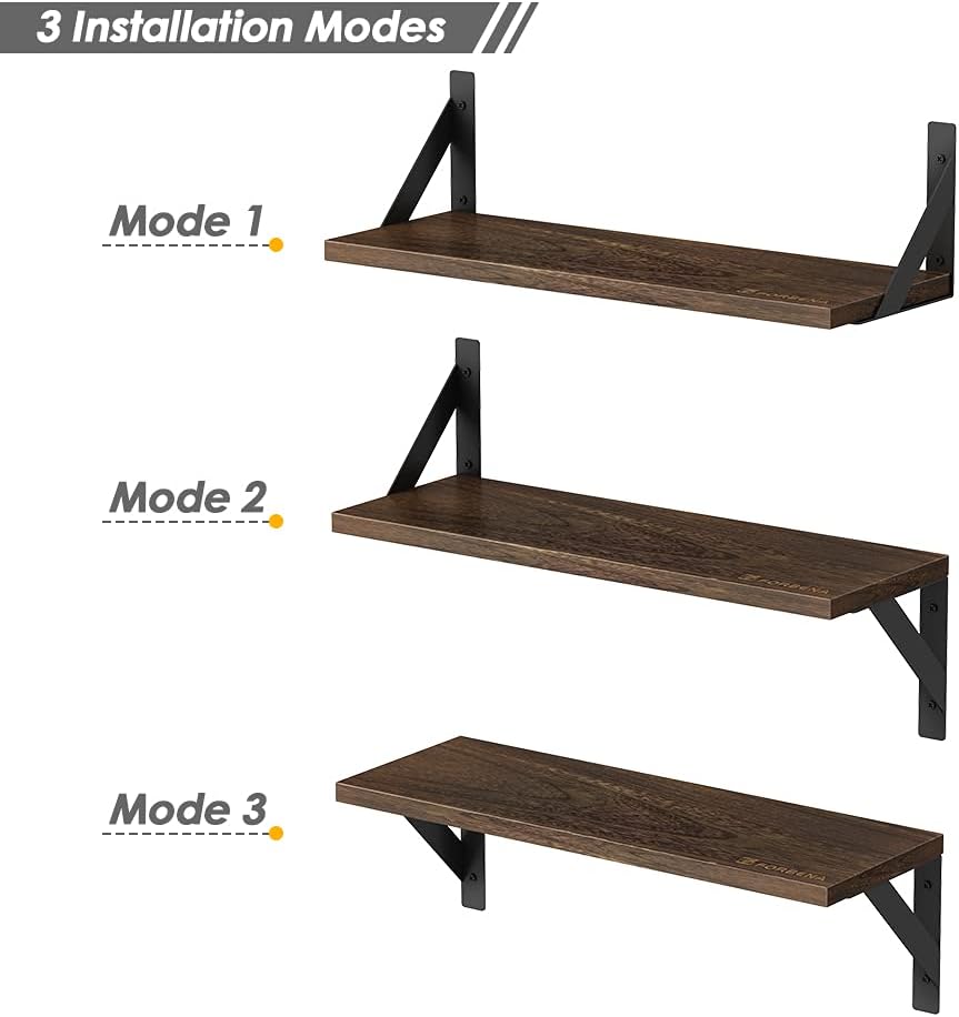 - 【Multiple combinations, More creativity】The classic triangle design of black metal bracket offers two display methods. Install these SAME SIZE shelves with the board on top of the brackets or below to concrete wall provide more decor choices. Hanging them as "a long bookshelf" or "a vertical bookshelf shelving unit" to showcase plants, perfume bottle, candle Jars, family pictures, albums, Knick knacks, stuffed toys, collectibles, picture books, kids books.