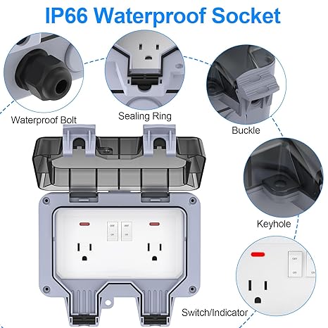 Our double outdoor receptacle has independent switches, indicator lights and lockable covers to prevent the outdoor electrical box from being accidentally opened and protect children. You don't need to unplug the plug frequently, just use a single tap of your finger to control the jack power. You and your family can use our outdoor sockets with confidence.