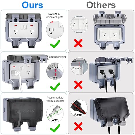 Close-enclosed design, IP66 Rating Protection, our outdoor electrical outlet box is completely waterproof and dust-proof, and outdoor electrical waterproof can be used in damp rooms or outdoor areas. The 6 CM deep design provides plenty of room for different types of US plugs to easily close the socket cover.