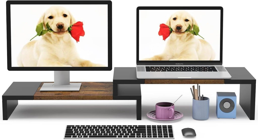 Computer Monitor Riser: This dual-monitor stand features a sturdy construction black with a rustic brown wood finish for an added rustic and unique look.